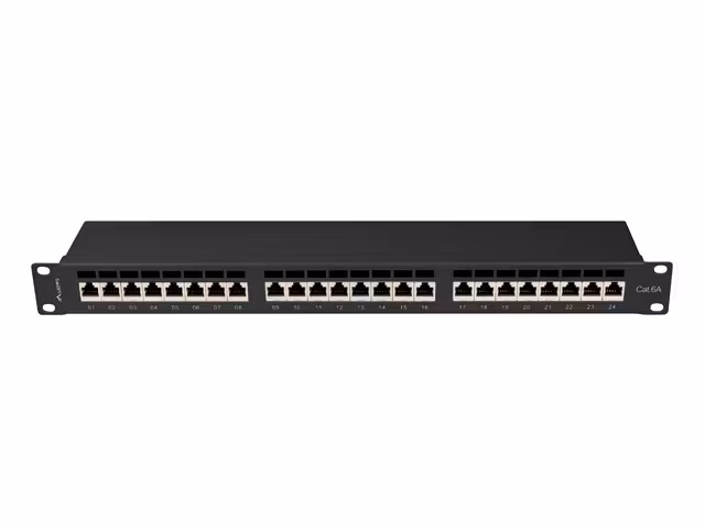 It is a passive part of structured cabling used for termination and organization of twisted-pair cables within 19" rack cabinets. Patch panels is equipped with 24 shielded RJ-45 ports category 6a.