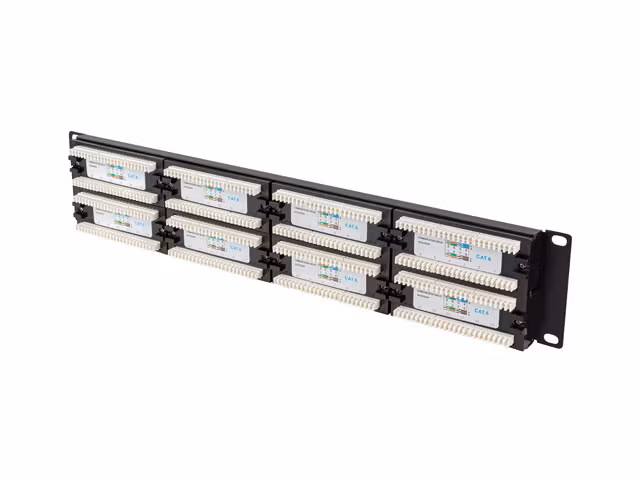 It is a passive part of structured cabling used for termination and organization of twisted-pair cables within 19" rack cabinets. Patch panels is equipped with 48 unshielded RJ-45 ports category 6.