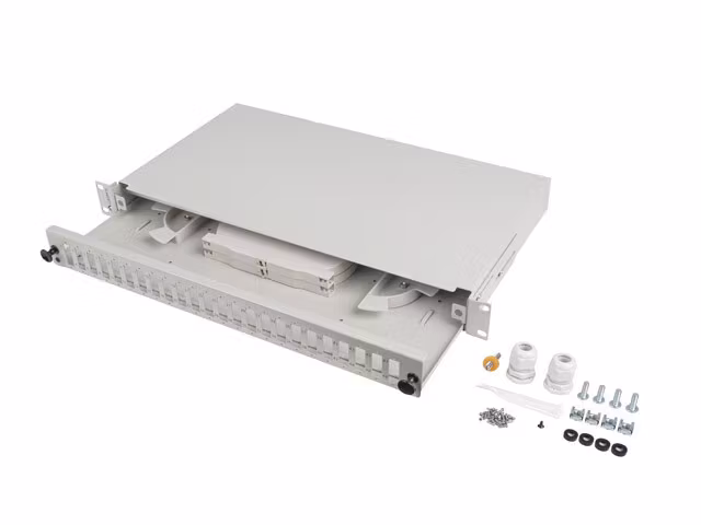 The 1U high pull-out fiber optic switch with mounting accessories is a product designed for installation inside 19" wide data communication cabinets. It was made entirely of durable powder-coated steel sheet.