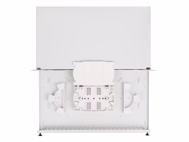 The 1U high pull-out fiber optic switch with mounting accessories is a product designed for installation inside 19" wide data communication cabinets. It was made entirely of durable powder-coated steel sheet.