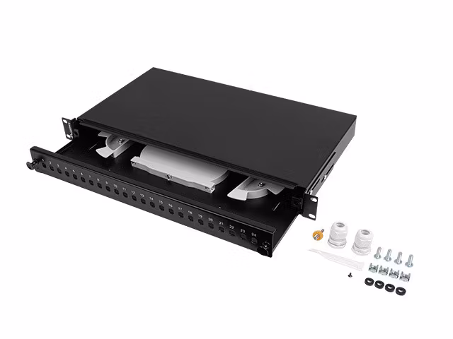 The 1U high pull-out fiber optic switch with mounting accessories is a product designed for installation inside 19" wide data communication cabinets. It was made entirely of durable powder-coated steel sheet.