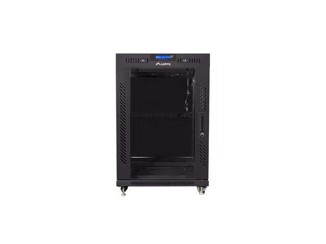 The Lanberg cabinet also includes lockable top and bottom panels with blanking panels, enabling convenient cable entry and concealment. This ensures a neat and well-organized installation, minimizing cable clutter. Additionally, the cabinet is equipped with front doors made of tempered glass with a lock, and rear steel doors. It offers the option for right or left-side door installation. The side panels are removable (with locks included), and the rear doors are made of solid steel with a lock. The cabinet also features a front-mounted LCD display with a thermostat function, displaying essential information such as the internal temperature, current time, and fan status.