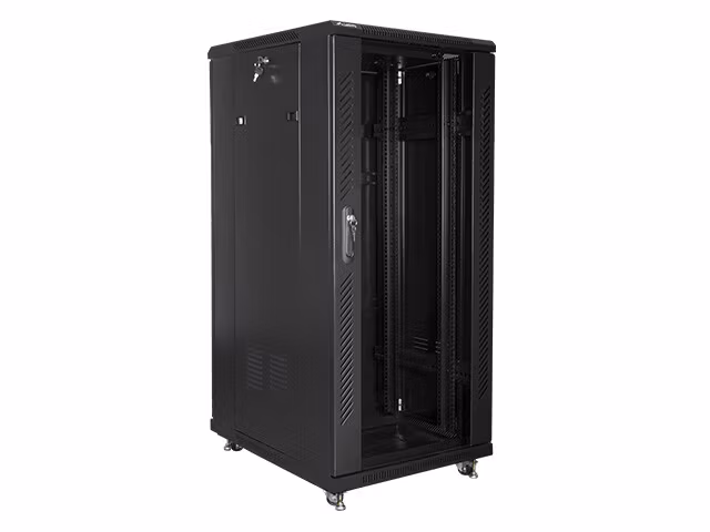 The cabinet's structure is made of high-quality rolled steel, which guarantees excellent design and durability. The cabinet allows full depth adjustment of the vertical mounting rails. It is equipped with a front tempered glass door with a lock, with the possibility of double-sided mounting. The side panels are removable (with locks included), and the rear door is made of full steel, which also has a lock. It is possible to insert cabling through the lockable top and bottom panels (with caps included).