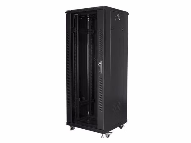 The cabinet's structure is made of high-quality rolled steel, which guarantees excellent design and durability. The cabinet allows full depth adjustment of the vertical mounting rails. It is equipped with a front tempered glass door with a lock, with the possibility of double-sided mounting. The side panels are removable (with locks included), and the rear door is made of full steel, which also has a lock. It is possible to insert cabling through the lockable top and bottom panels (with caps included).