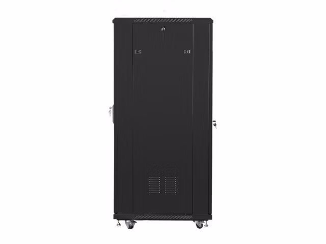 The cabinet's structure is made of high-quality rolled steel, which guarantees excellent design and durability. The cabinet allows full depth adjustment of the vertical mounting rails. It is equipped with a front tempered glass door with a lock, with the possibility of double-sided mounting. The side panels are removable (with locks included), and the rear door is made of full steel, which also has a lock. It is possible to insert cabling through the lockable top and bottom panels (with caps included).