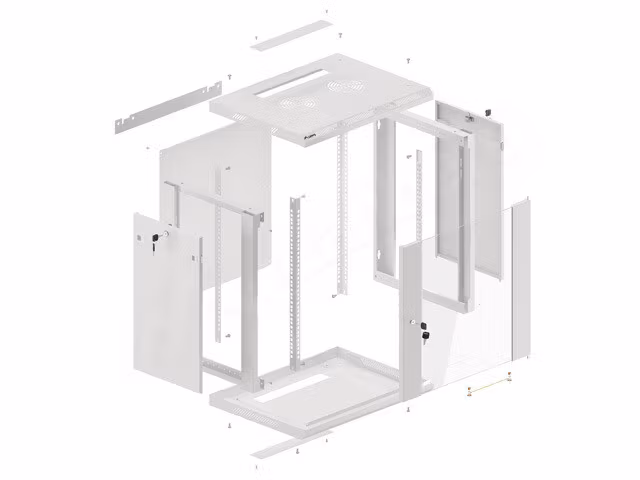 - Included: Accessory bag, earth kit (pins, grounding cable, nuts and mounting washers), front door lock, two side panels with locks, 12 cage nuts M6.